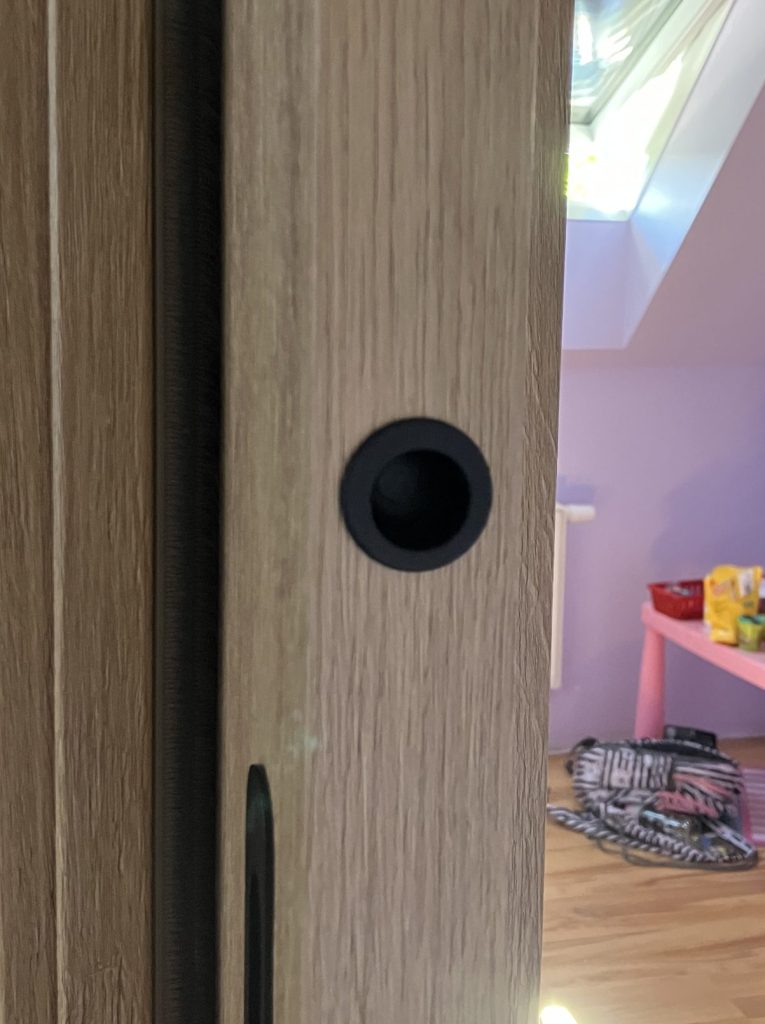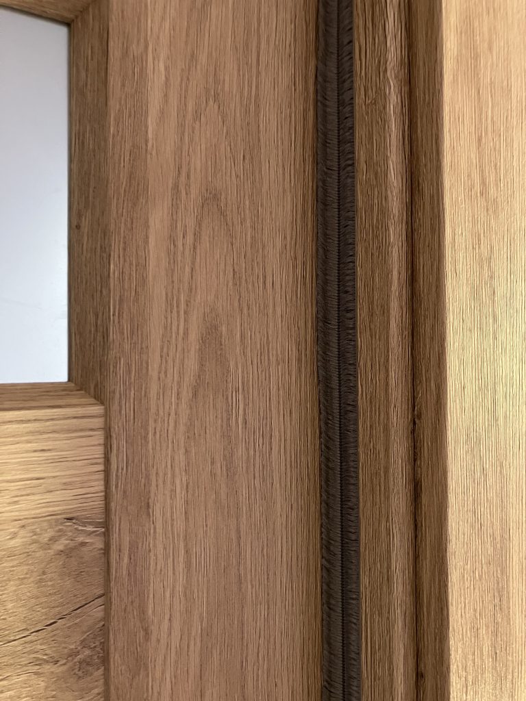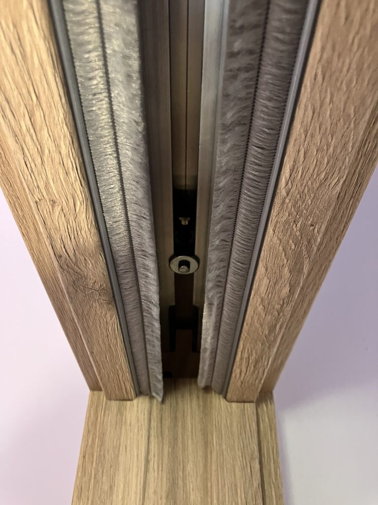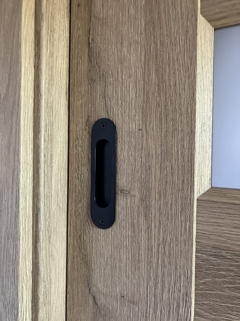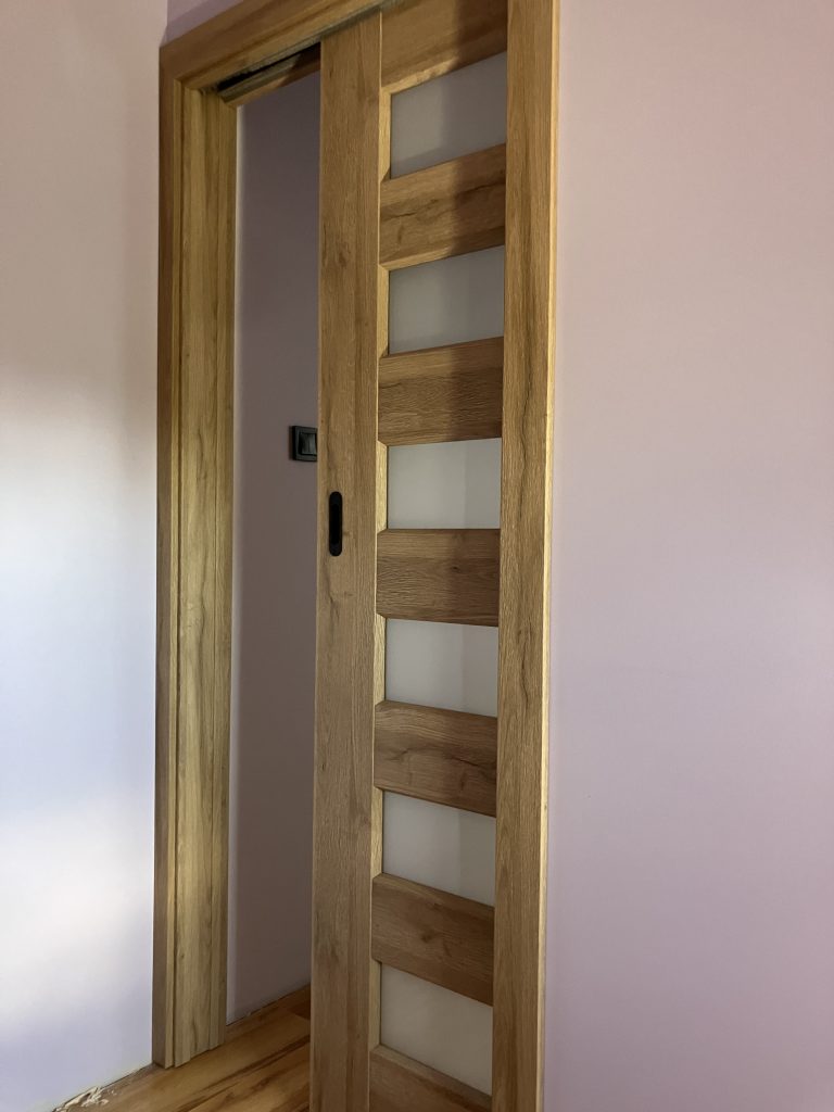 Montaż drzwi wewnętrznych przesuwnych DRE Elsa, model Elsa 0, szyba Mat DRE, kolor Dąb Vintage (dekor DRE-Cell). Drzwi „chowane w ścianę”, umieszczone w kasecie ościeżnicowej PA 125 mm zabudowanej płytami G-K i wykończonej tzw. tunelową obudową kasety z opaskami o szerokości 80 mm. Skrzydło wyposażone w uchwyty owalne i uchwyt czołowy (naparstek) w kolorze czarny mat.