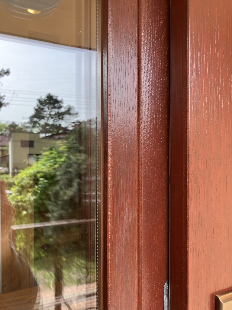 Wymiana drzwi zewnętrznych na drzwi drewniane płytowe Derpal, model ARIE, szyba matowa z przezroczystymi paskami, kolor Mahoń. Drzwi dębowe, grubość skrzydła 74 mm. Ościeżnica drewniana z progiem drewnianym. W miejscu starego okna naświetle boczne stałe o wymiarach 64 x 60 cm, skręcone z ościeżnicą podczas montażu. Klamka SPACE w kolorze Patyna.