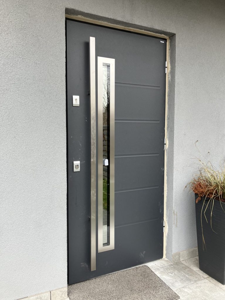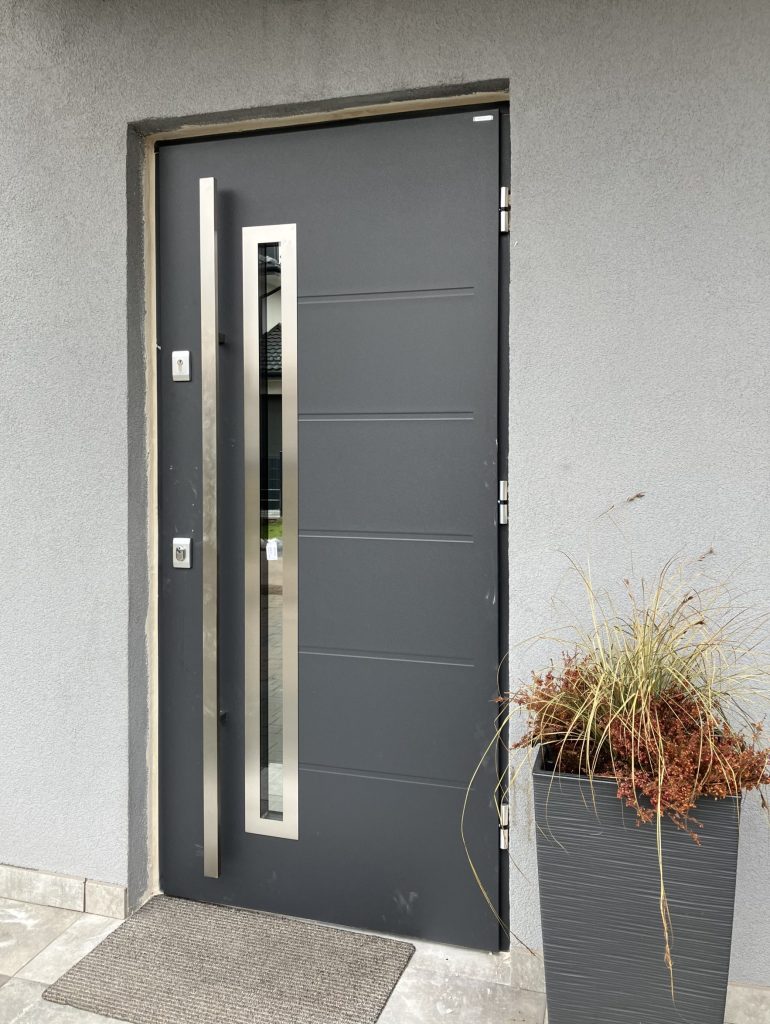 Wymiana drzwi zewnętrznych na drzwi metalowe Gerda OPTIMA 60, wzór Milano 4 (SNU), kolor Antracyt, szyba Reflex Grafit. Ościeżnica stalowa PERFOTHERM 60 z perforacją termiczną, uszczelką i progiem aluminiowym. Drzwi wyposażone w pochwyt prostokątny Amsterdam ze stali nierdzewnej (długość 180 cm) i elektrozaczep.