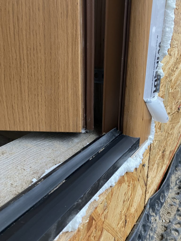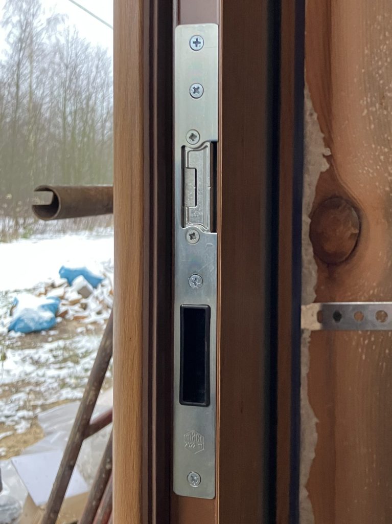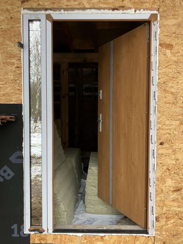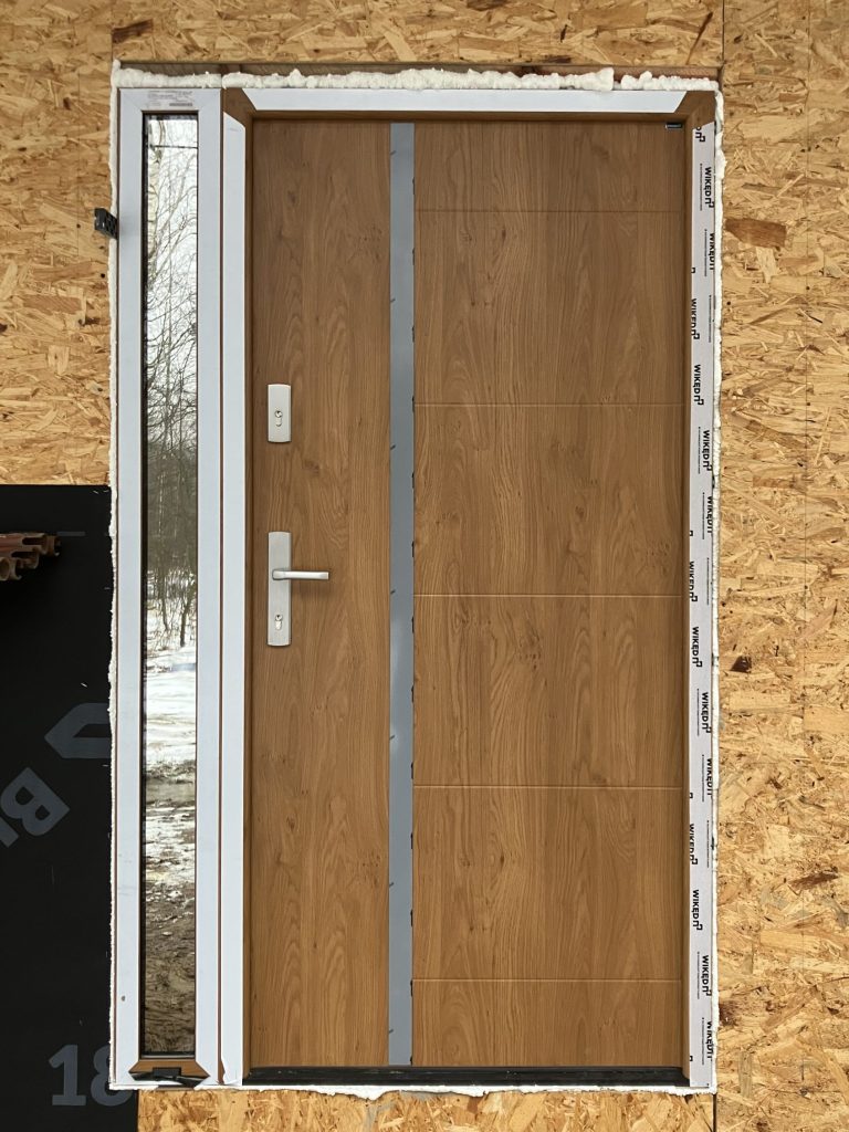 Montaż drzwi zewnętrznych metalowych WIKĘD Premium, wzór 41 z aplikacją INOX (z jednej strony drzwi, od zewnątrz), kolor Winchester. Ościeżnica aluminiowa ciepła Termo Premium z ciepłym progiem PVC. Naświetle boczne z ciepłego profilu aluminiowego Termo z pakietem 3-szybowym ze szkłem Lustro Weneckie. Klamka PRIME w kolorze INOX. Szerokość całkowita 124,5 cm (drzwi typowe szerokość ościeżnicy 102,5 cm plus 22 cm szerokość naświetla).