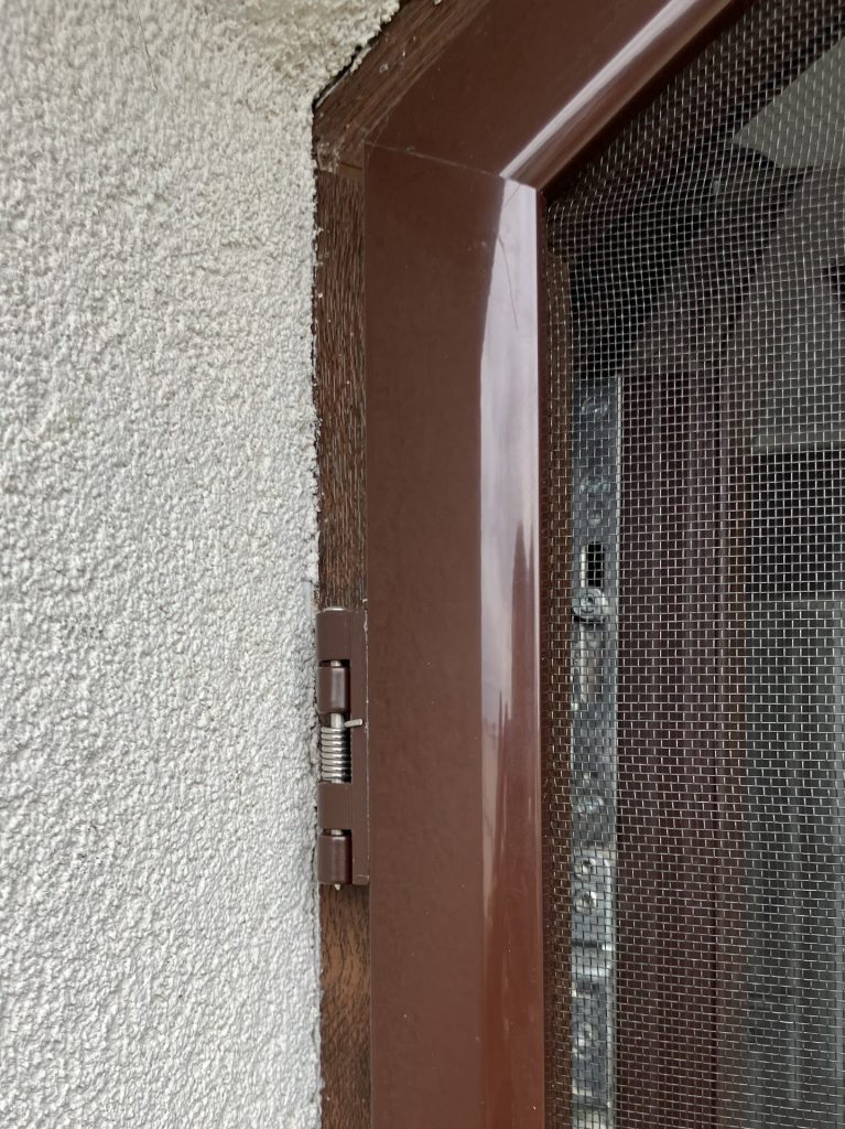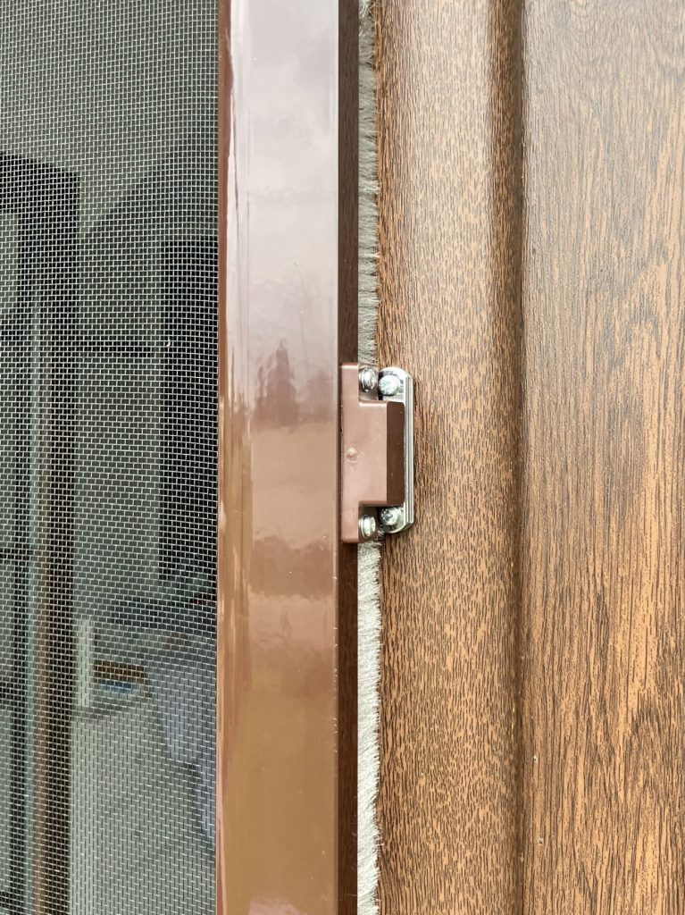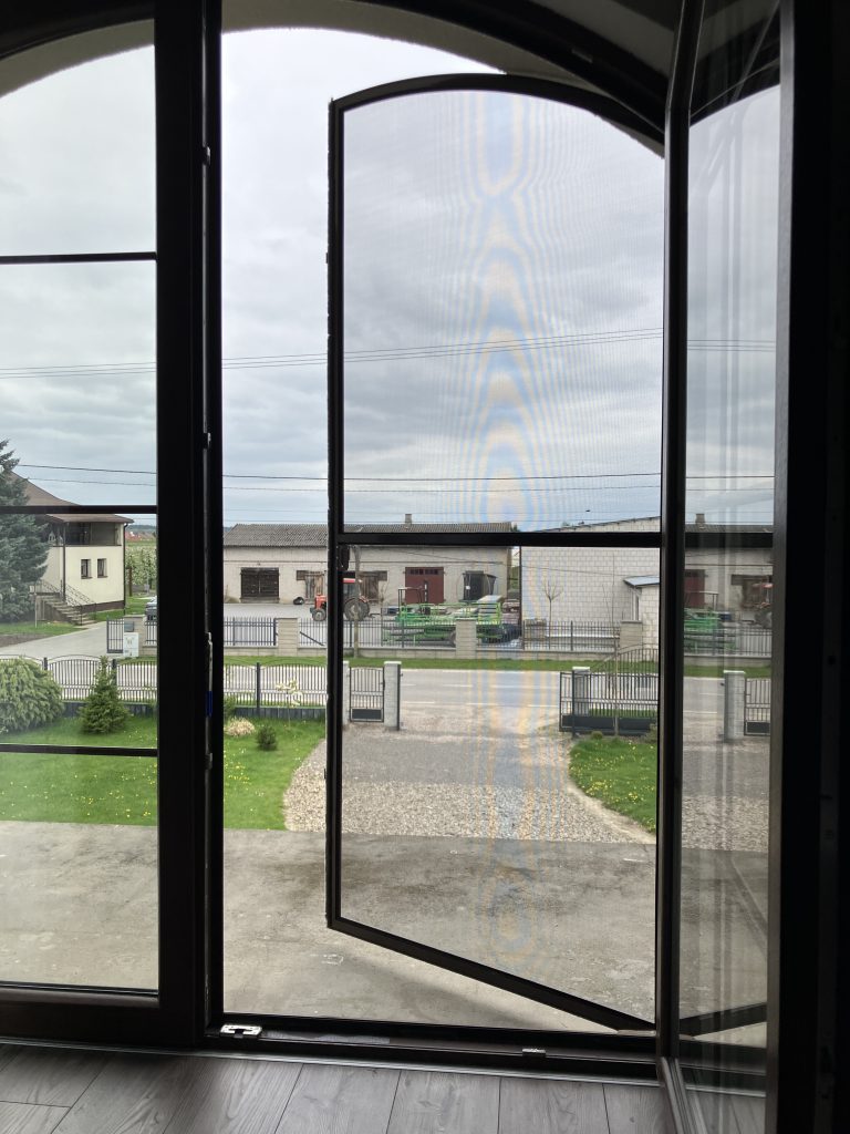 Montaż moskitiery drzwiowej pół-łuk do okna balkonowego łukowego. Siatka w ramie wykonanej z profili aluminiowych montowana jest do ościeżnicy okiennej za pomocą zawiasów samozamykających. Moskitiera obsługiwana jest za pomocą uchwytu i zamykana na zamki magnetyczne. Dla wzmocnienia konstrukcji moskitiera posiada wbudowaną poprzeczkę poziomą. Rama w kolorze brąz (RAL 8017).