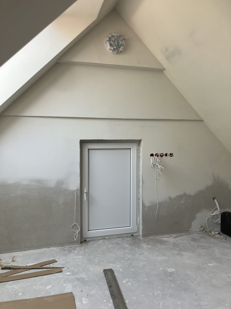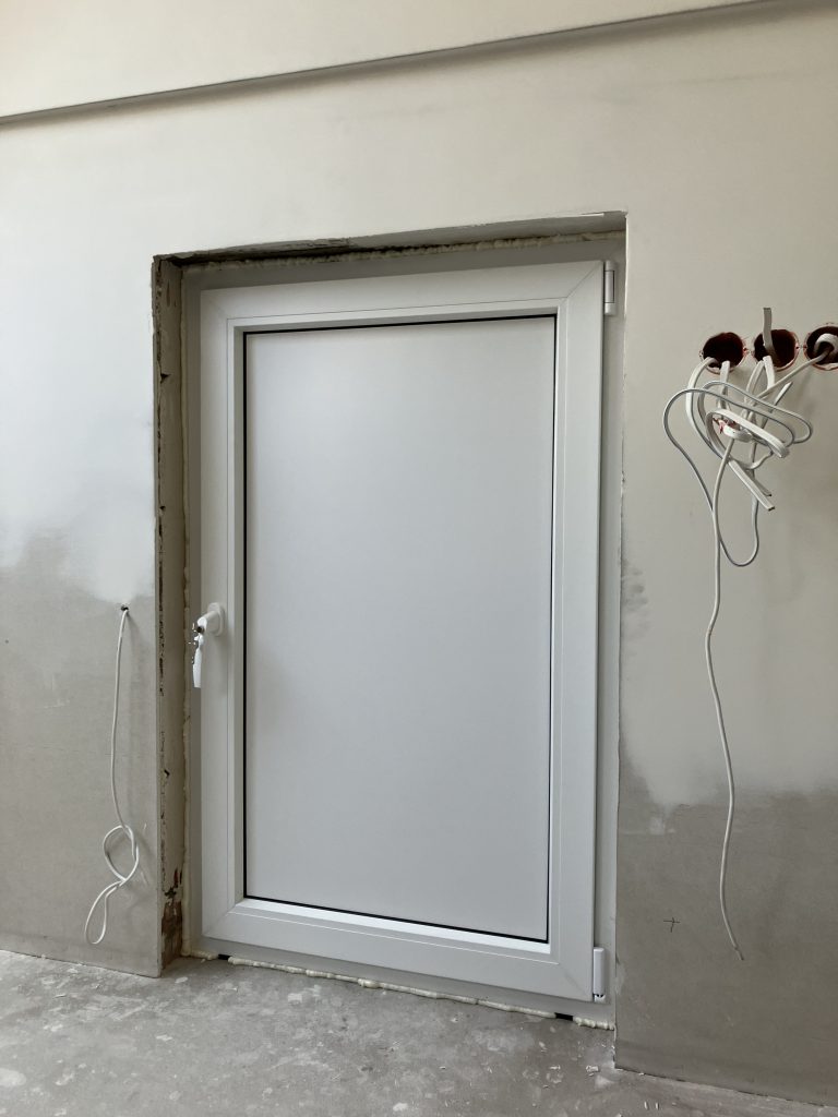 Montaż okna AdamS Comfort-line profil AS Classic w ścianie wewnętrznej na poddaszu użytkowym. Ściana w której zamontowano okno oddziela przestrzeń funkcjonalną od niskiej przestrzeni nieogrzewanej pod skosem. Okno zapewnia odpowiednią izolację, a w razie potrzeby umożliwia dostęp do niezagospodarowanej części poddasza. Zamiast szyby zastosowano panel termoizolacyjny o grubości 24 mm. Okna wyposażono w klamkę z kluczykiem.