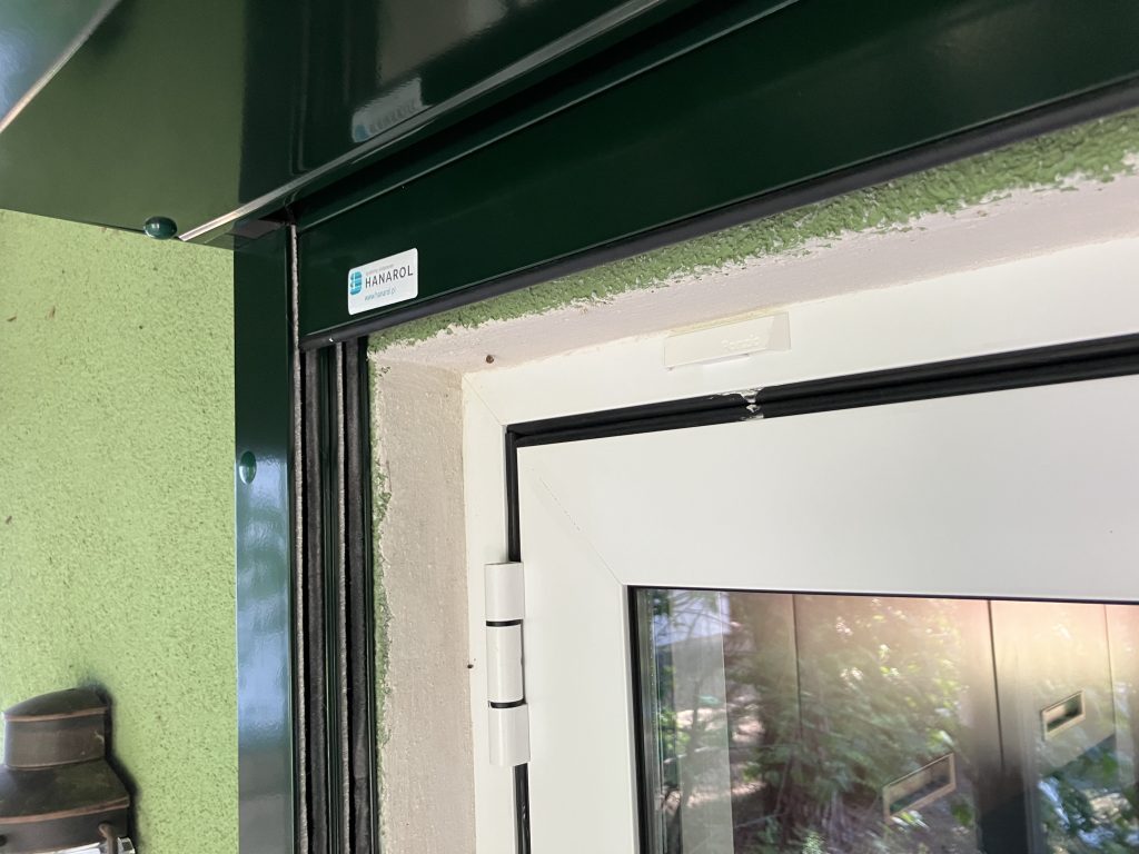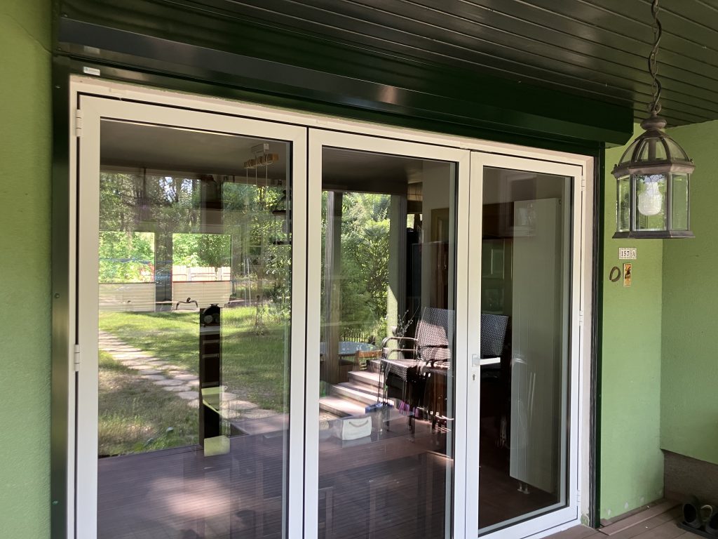 Montaż zewnętrznej rolety antywłamaniowej do drzwi tarasowych o wymiarach 296 x 229 cm. System adaptacyjny, przeznaczony do istniejących budynków – roleta montowana na elewację, na prowadnicach dystansowych. Skrzynka o wymiarach 20,5 x 20,5 cm, ścięta po kątem 45 st. Pancerz zbudowany z profili AR40 wykonanych z blachy aluminiowej, wypełnionych pianką poliuretanową. Całość w kolorze zielonym „green fir”. Roleta wyposażona w silnik elektryczny Yooda 45 R (30 Nm, 15 obr/min) z wbudowanym odbiornikiem radiowych, obsługiwana pilotem.
